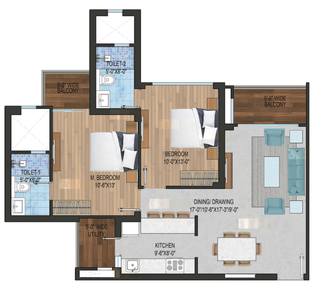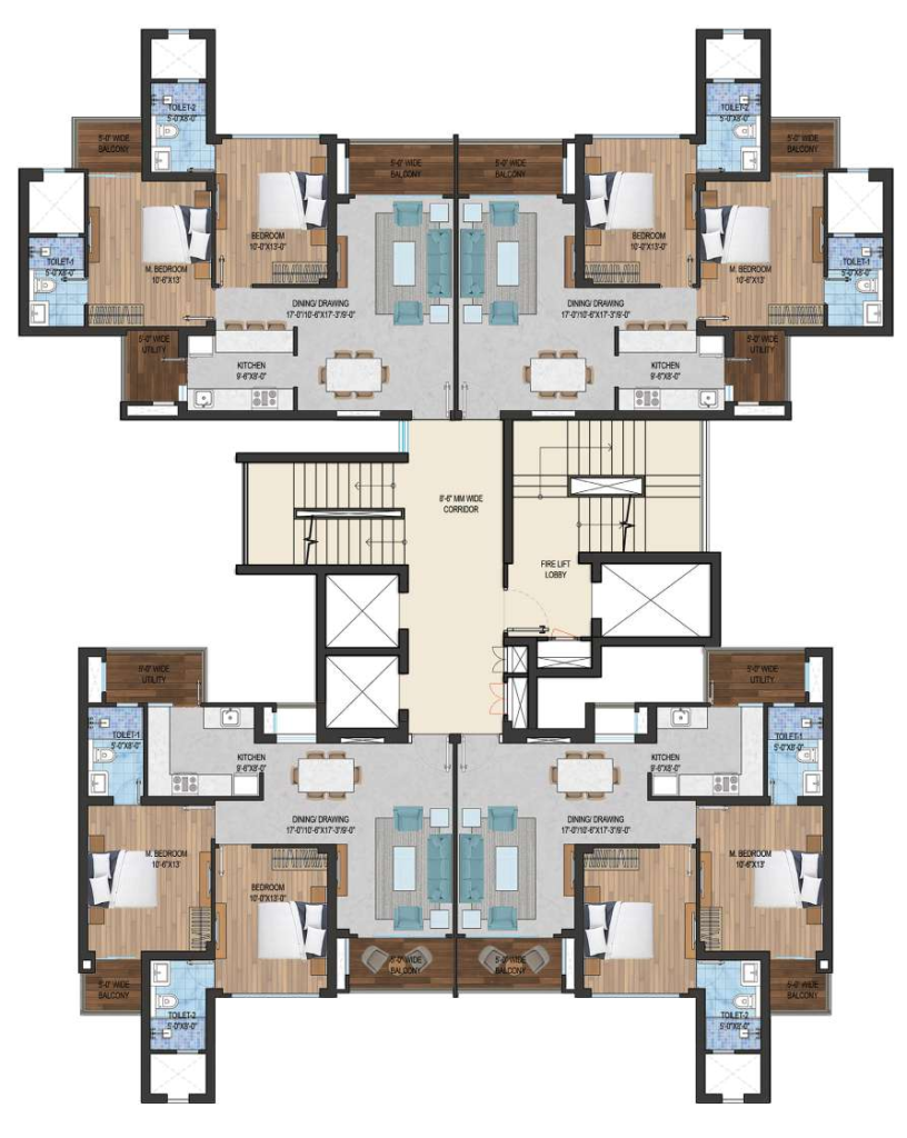 | Electrical Fixtures / Fittings | Modular touch switches with copper wiring, standard ceiling fans in all rooms (except toilets). Exhaust Fan in Toilet & Kitchen & ceiling light fixtures in Balconies. | |