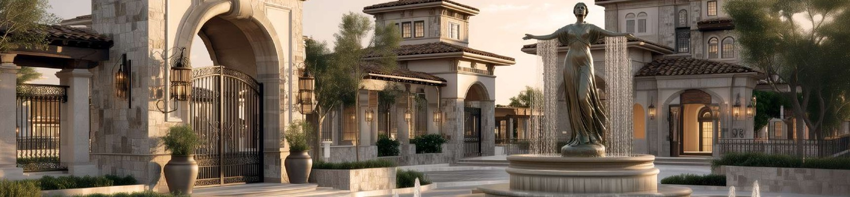 Grand entry/exit gate complex, Grand tiered fountain at the entrance, Water feature with sculpture