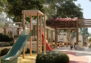 Biophilic design with rooftop gardens, open kids' play area, and scenic green zones